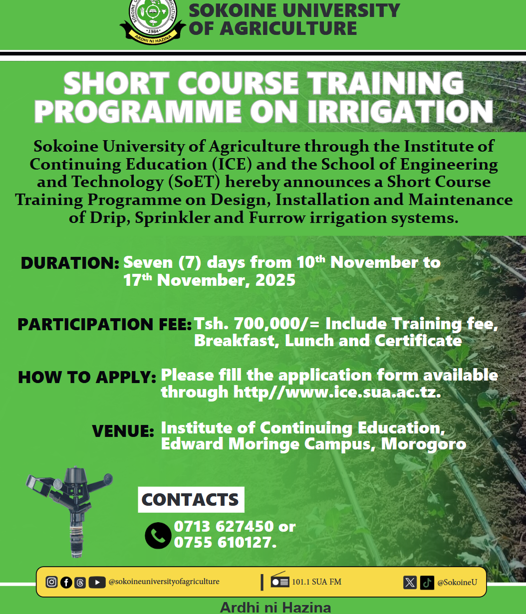 Sokoine University of Agriculture(SUA) Through the Institute of Continuing Education(ICE) and the School of Engineering and Technology(SOET)hereby announces a short…