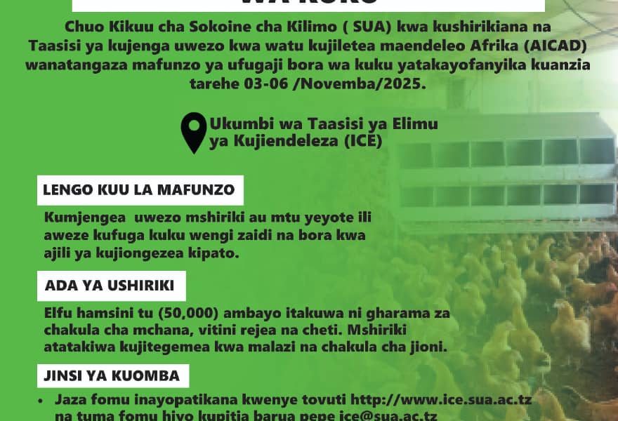 Watatoa mafunzo ya ufugaji bora wa kuku kuanzia tarehe 03/11 hadi tarehe 06/11/2025.jaza fomu inayopatikana kwenye hii link hapa chini